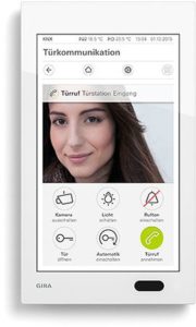 In Verbindung mit dem Gateway und einer Türstation Video kann der neue moduel als Wohnungsstation eingesetzt werden. Klingelt es, erscheint im Display automatisch das Kamerabild. Mit einem Fingertipp kann die Kommunikation gestartet, die Tür geöffnet oder das Licht eingeschaltet werden.